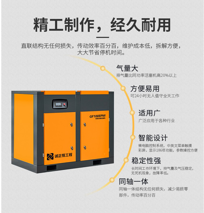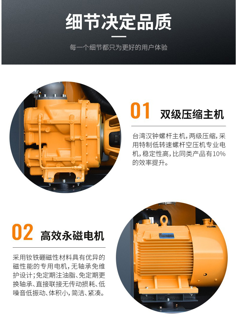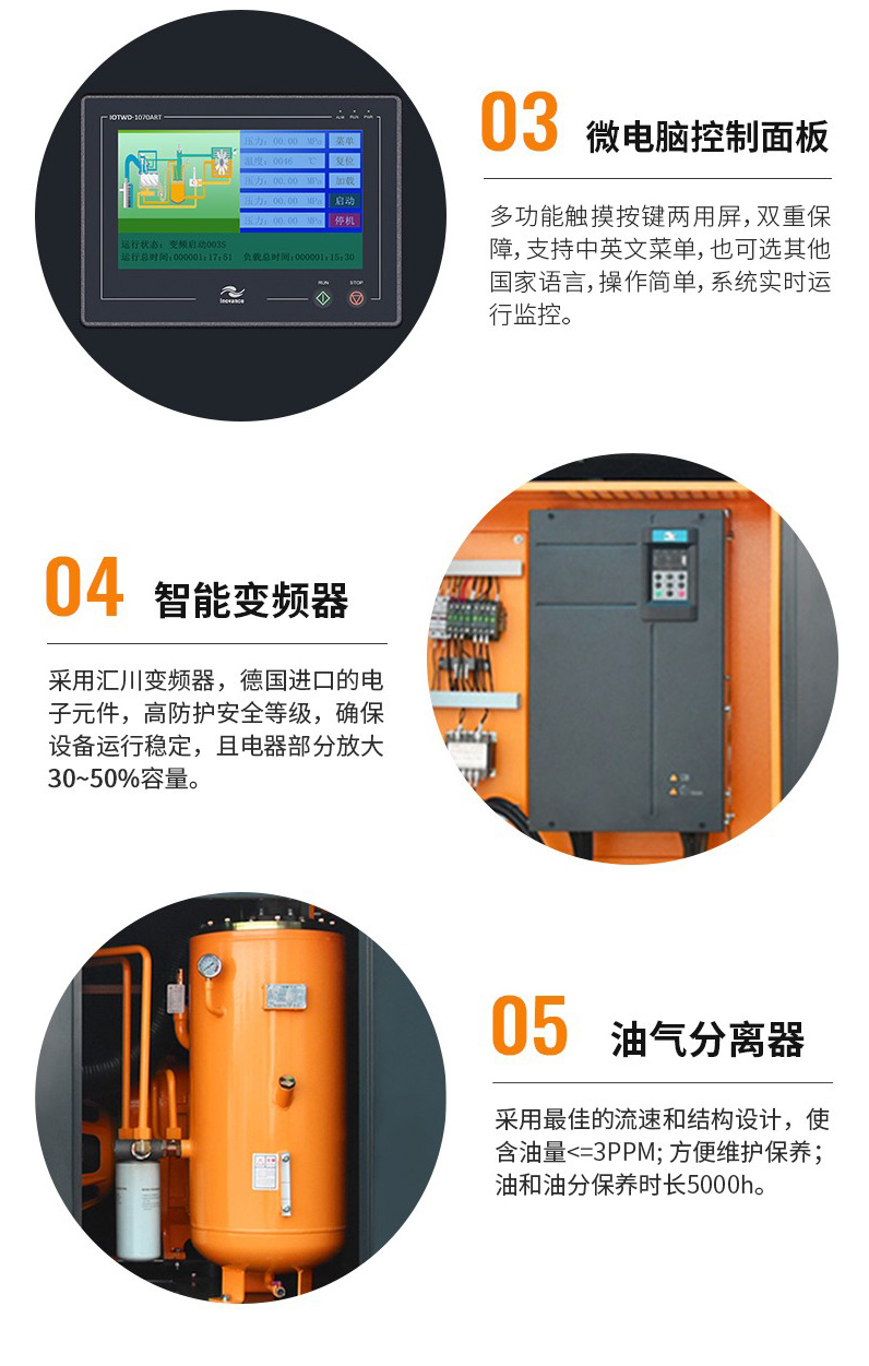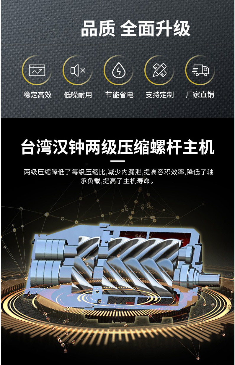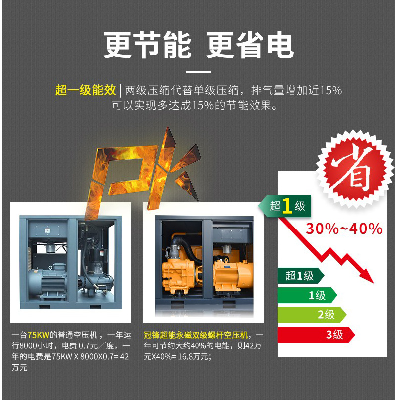 雙級(jí)壓縮主機(jī)更高效、更節(jié)能較雙螺桿空壓機(jī)節(jié)能高達(dá)35%以8000h/臺(tái)/年計(jì)算,每年可節(jié)約20萬元電費(fèi)。